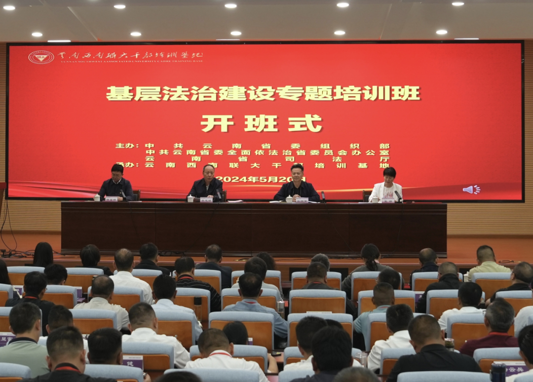 为深入学习贯彻习近平法治思想,打通党中央全面依法治国决策部署和省委全面依法治省工作要求在基层落地落实的“最后一公里”,提高基层法治建设能力水平,2024年5月20日,由省委组织部、省委依法治省办和云南西南联大干部培训基地联合举办的基层法治建设专题培训班在昆明开班。省委依法治省办副主任,省司法厅党委书记、厅长作动员讲话。