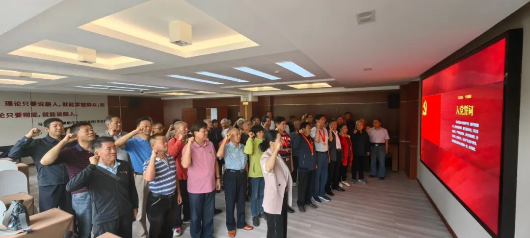 面对党旗,老党员高举右拳,重温入党誓词。短短80字的入党誓词,对于党员来说就是信仰的灯塔、初心的映射、纪律的红线。铿锵有力的宣誓声响彻大厅,表达了老党员对党的无限忠诚和为共产主义奋斗终身的坚定决心。