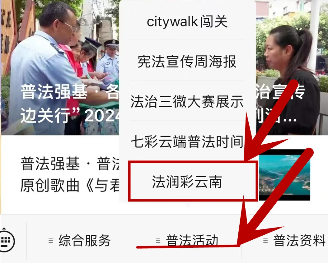 2、关注“云南普法”微信公众号,点击页面下端“普法活动”字样,待小窗口弹出后点击“法润彩云南”字样,直接参与。【详见下图所示↓】