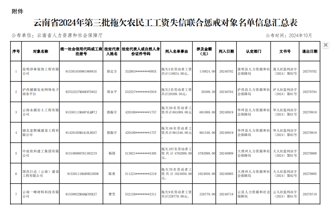 为加快推进社会信用体系建设,构建跨地区、跨部门、跨领域的失信联合惩戒机制,依据人力资源和社会保障部《拖欠农民工工资失信联合惩戒对象名单管理暂行办法》(人力资源社会保障部令第45号)和云南省人力资源和社会保障厅《关于贯彻落实〈拖欠农民工工资失信联合惩戒对象名单管理暂行办法〉的通知》(云人社通〔2021〕99 号),现将2024年第三批被各州(市)、县(市、区)列入拖欠农民工工资失信联合惩戒对象名单的单位及个人予以公布。