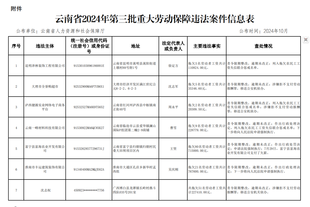 附件:云南省2024年第三批重大劳动保障违法案件信息表