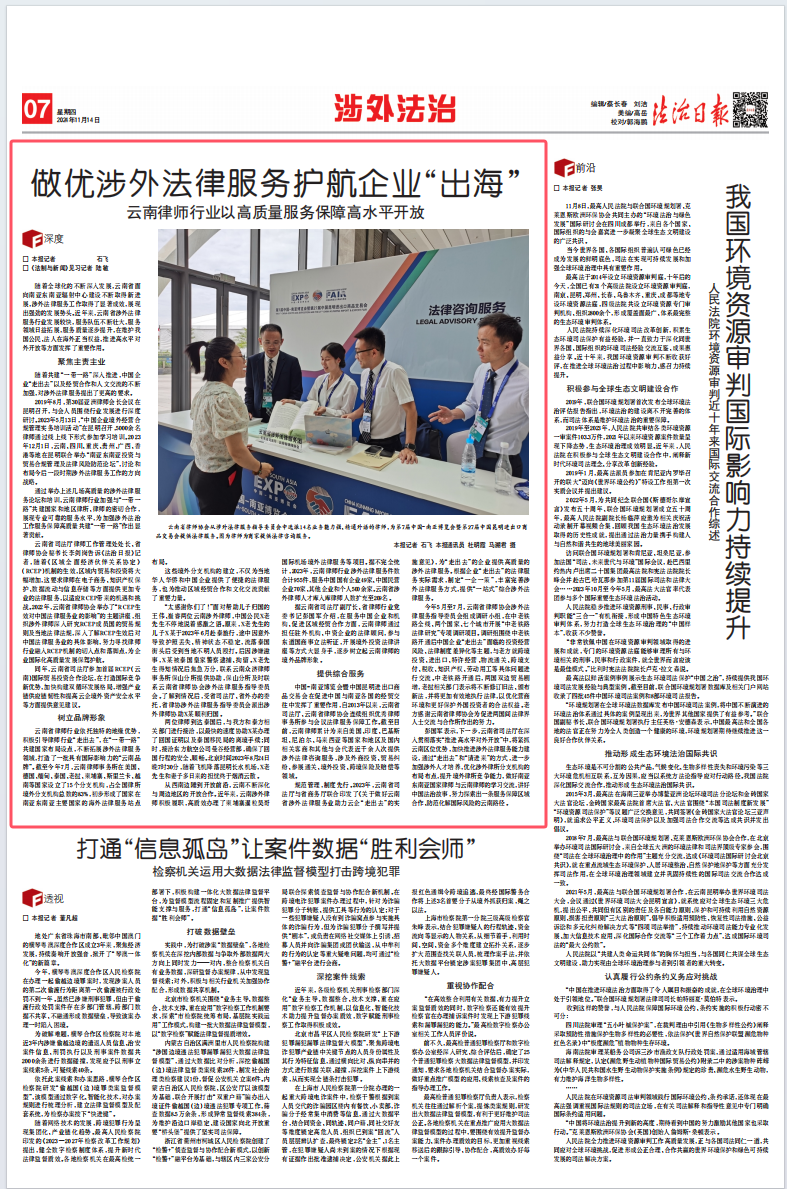 从西南边陲到开放前沿,云南不断深化与周边地区的开放合作。近年来,云南涉外律师积极履职,高质效办理了柬埔寨暹粒吴哥国际机场境外法律服务等项目。据不完全统计,2023年,云南律师行业涉外法律服务件数合计955件,服务中国国有企业49家、中国民营企业70家、其他企业和个人500余家。云南省涉外律师人才库入库律师人数扩充至209名。