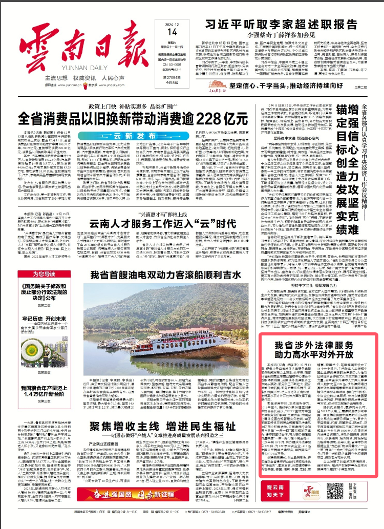 12月13日,记者从云南省涉外法律服务典型案例新闻发布会上获悉,近年来,随着我省面向南亚东南亚辐射中心建设不断取得新进展,云南涉外法律服务工作势头强劲,服务队伍不断壮大、服务领域日益拓展、服务质量逐步提升,在维护我国公民、法人在海外正当权益,推进高水平对外开放等方面发挥了重要作用。