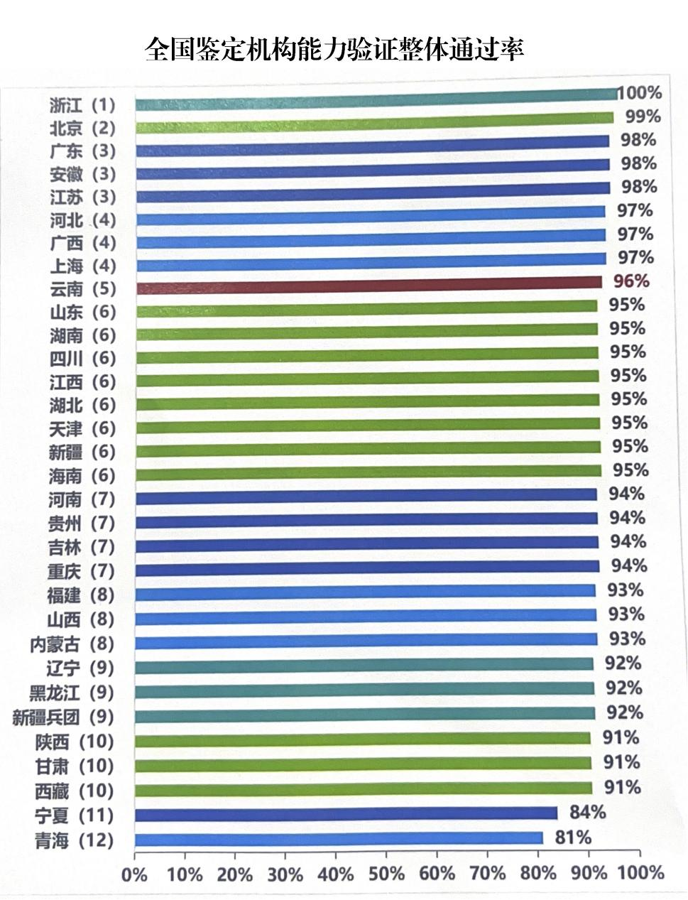 为持续提升司法鉴定质量,确保鉴定结果的科学性、准确性和公信力,根据司法部公共法律服务管理局《关于组织开展司法鉴定能力验证活动有关工作的通知》要求,省司法厅组织全省法医类、物证类、声像资料等部分司法鉴定机构报名参加了由上海司法鉴定科学研究院组织的2024年度全国能力验证工作。全省共有69家司法鉴定机构报名参加,共涉及11个司法鉴定专业和42个能力验证项目,参加总项次数为397项次,有效反馈率为98.99%,整体通过率为96%,高于全国整体通过率一个百分点,居于全国第5位。近三年来我省整体总通过率分别为85%、90%和96%,鉴定能力、水平和质量持续提升。本次能力验证通过率较高,充分反映出我省实施司法鉴定机构和司法鉴定人严格准入和严格监管机制,推进鉴定机构规范化建设取得明显成效。