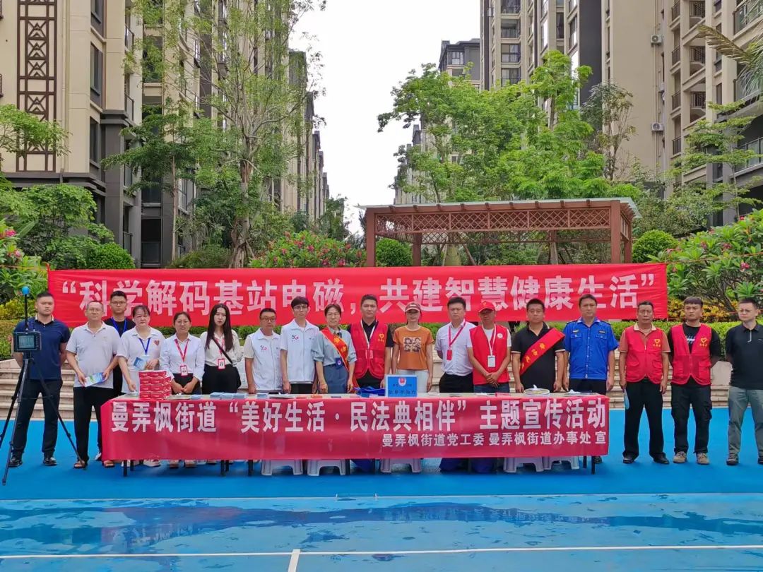 5月28日上午,景洪市司法局曼弄枫司法所联合景洪市科工局、州生态环境局景洪分局、中国铁塔股份有限公司西双版纳州分公司景洪办事处、街道综治办、执法队等单位到曼弄枫雨林时光小区开展“美好生活·民法典相伴”主题宣传活动。