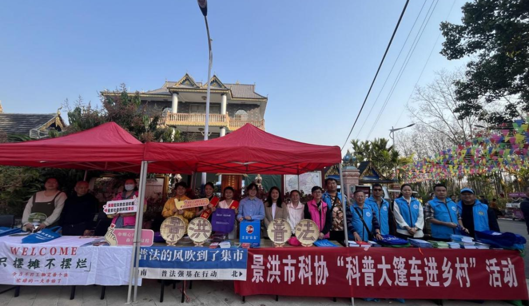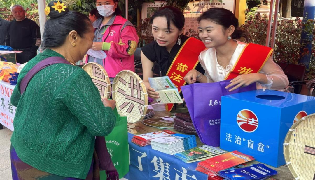 活动现场,普法摊点、普法展板、科普大篷车一应俱全,普法志愿者向前来参加活动的游客和群众宣传民法典、宪法、未成年人保护法等有关法律法规,遇到听不懂普通话的傣族“老咪涛”(傣语:奶奶),普法志愿者就耐心地用傣语向“老咪涛”解释和解读相关的法律知识。通过“法治+科普”宣传,引导群众在任何时候都要依法办事,以理性合法的形式表达利益诉求,营造和谐文明的生活环境。活动现场除了向群众讲解法律知识之外,普法志愿者还准备了趣味法治“盲盒”,以“答对有奖”的形式开展,吸引了大量的游客和群众前来参与竞答。