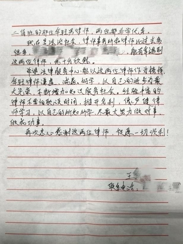这封感谢信不仅承载着群众对五华区公共法律服务中心的信赖和认可,同时也是一种激励和鞭策。两位律师收到感谢信后均表示群众的赞许是他们值班工作中不断前行的动力,今后也将继续践行五华区公共法律服务标准规范,不断提高自身的服务水平和能力,不辜负中心和群众的信任。