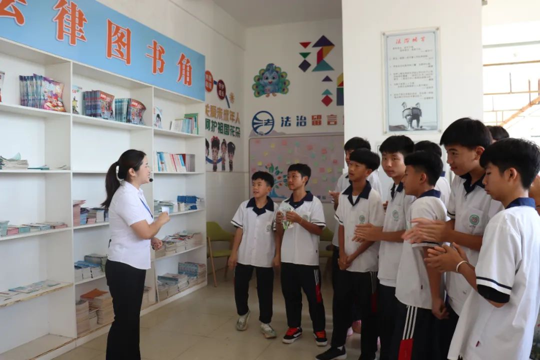 普法志愿者化身为基地讲解员,在讲解员的带领下,同学们首先解锁了基地的“五大法治宝藏”。从学校入口处的“前哨站”法治宣传牌,到藏着155种法律书籍的“充电站”——法律图书角,墙上的法治格言牌仿佛跨越时空的智慧对话,让同学们忍不住驻足品读。