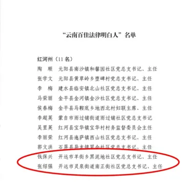钱保兴、张绍强是开远市2022年第一批遴选的“法律明白人”,也是开远市优秀“法律明白人”代表,曾于2023年被中共云南省委宣传部、云南省司法厅、云南省普及法律常识办公室评为云南省“普法强基·云南百佳十优法律明白人”。他们引领开远市这支群众身边的队伍广泛参与社区法治宣传、矛盾纠纷调解、社情民意收集、法律服务引导、基层社会治理等具体工作,让“法律明白人”真正成为群众学法的良师益友、用法的“参谋助手”,深入基层当群众讲法、说理的对象,为村(社区)构建多方参与、共同治理、成果共享的基层治理新体系作出了积极贡献。