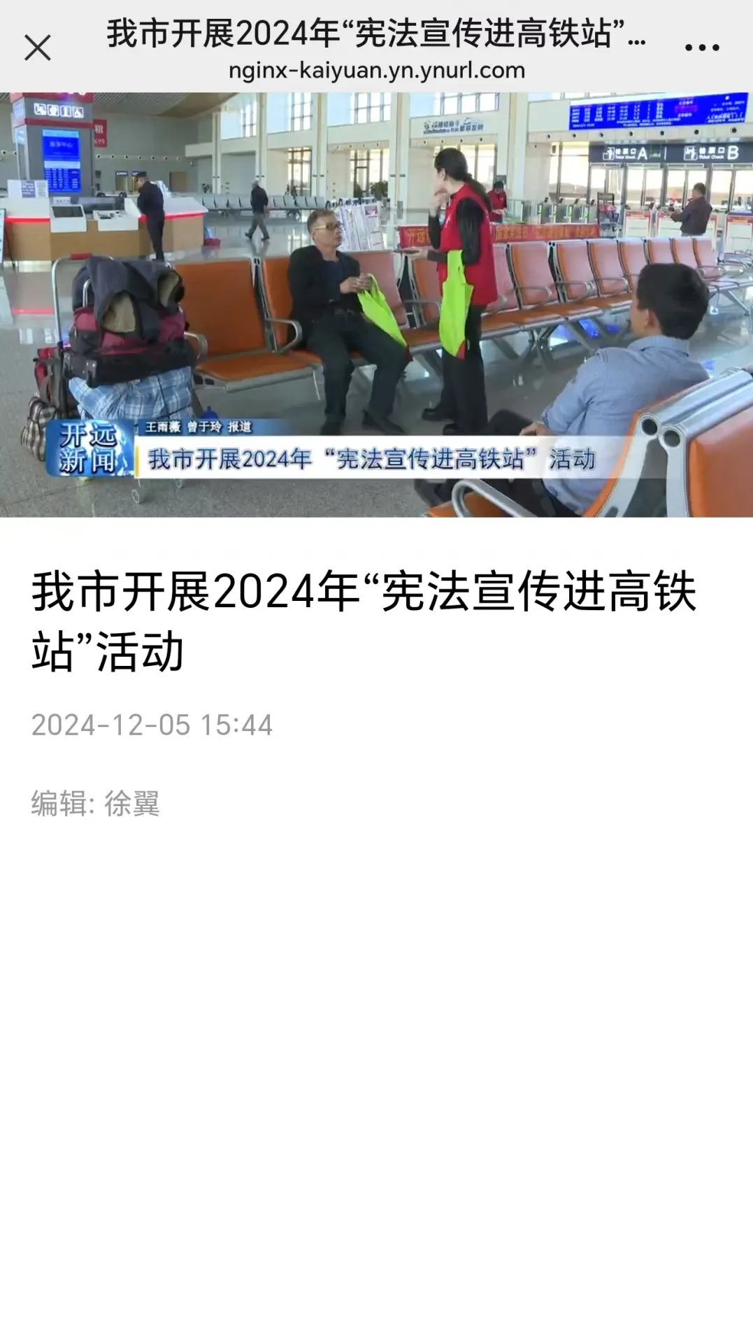 市司法局和开远铁路公安处开远南站派出所于12月3日联合开展一站“警”相随、一路“法”相伴——“宪法进高铁站”主题法治宣传活动。通过在弥蒙高铁开远南站候车厅设置常态化“高铁站普法园地”、联合组建“司法警蓝普法志愿服务队”在红河开往大理的高铁列车上开展“流动法治课堂”,在候车厅开展“有奖法律知识竞答课堂”,实现了“以站保车”的普法宣传效果。