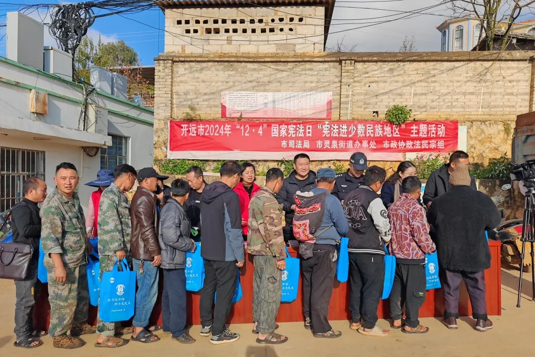 市司法局、市灵泉街道办事处、市政协民宗组联合于12月5日在灵泉街道办事处崩打村委会开展2024年“宪法进少数民族地区”主题宣传,通过开展村内集中法治宣传、“以案释法”法治讲座、“法治副村长”微课堂、“法治暖阳”爱心捐赠为边远山区少数民族群众送去法治温暖。