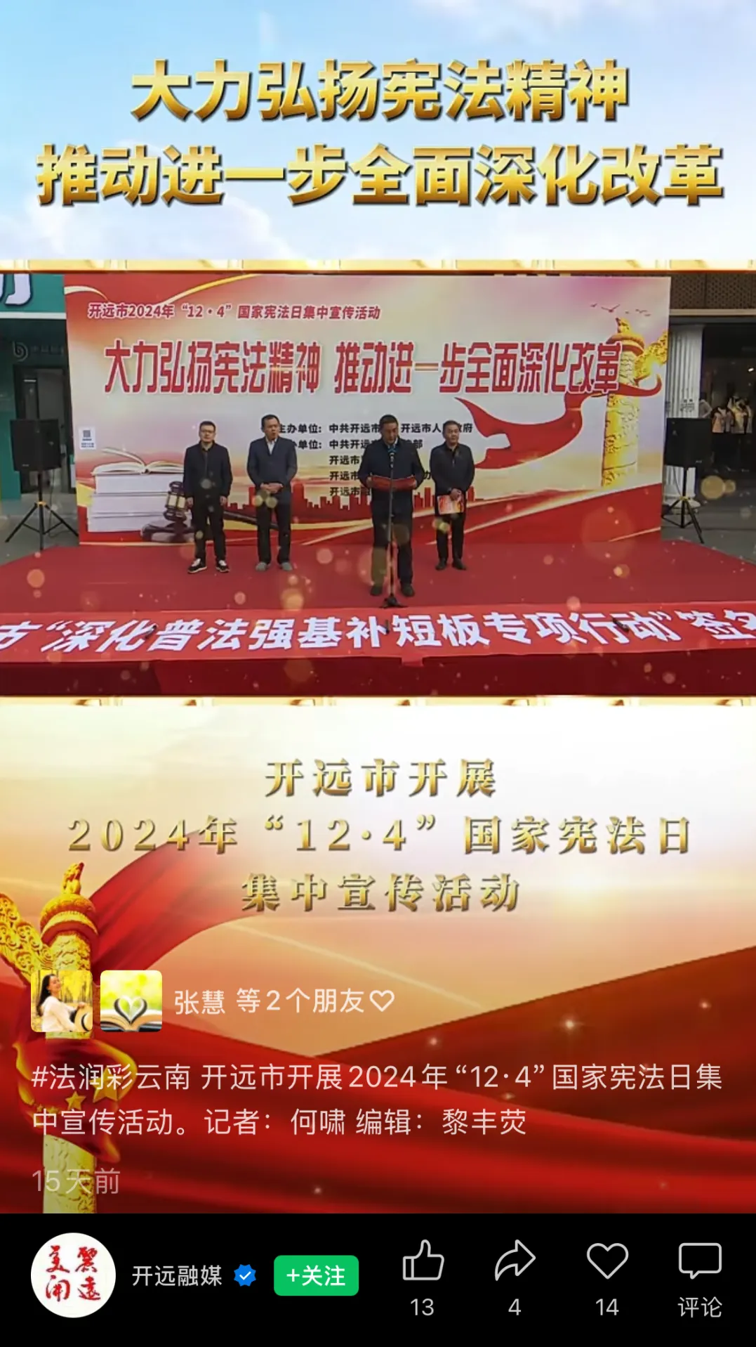 市融媒体中心充分运用开远新闻、美丽开远视频号、微信公众号、抖音等媒体及时宣传报道开远市各级各部门宪法宣传活动情况。市司法局、市普及法律常识办公室于12月4日运用手机短信方式向全市手机用户推送宪法宣传公益短信;组织全市各单位干部职工参与“红河州宪法知识线上答题活动”。全市各单位、社区充分运用微信公众号、QQ群、微信群转载、转发宪法法律知识文章、视频。有力推动了线上学法和掌上普法。