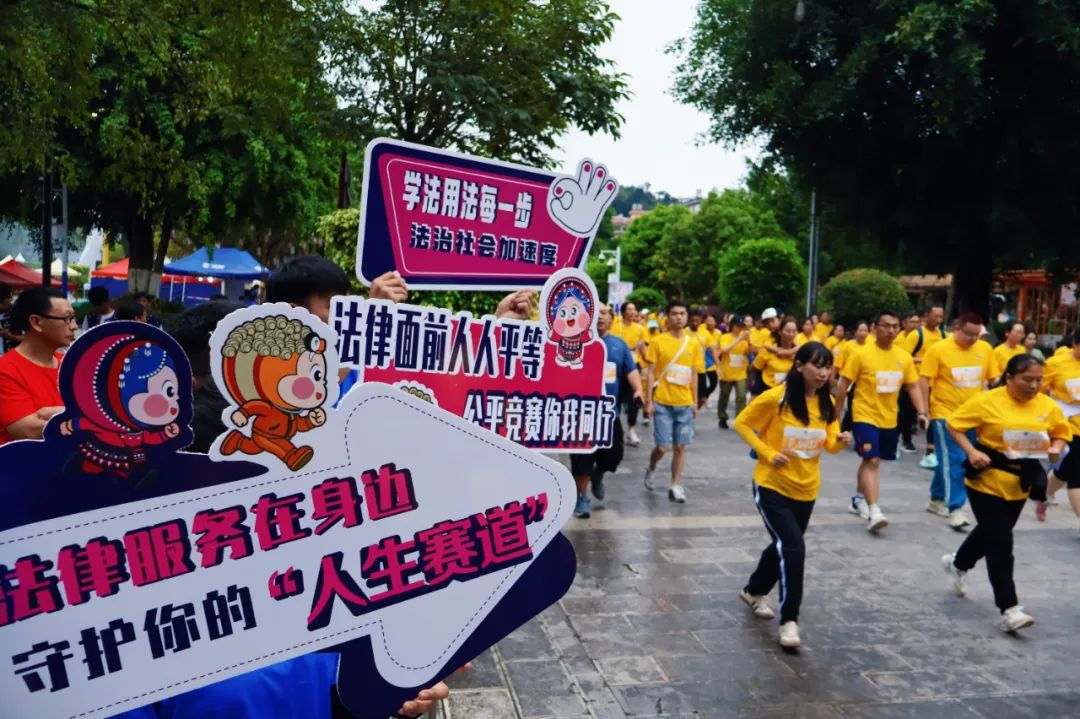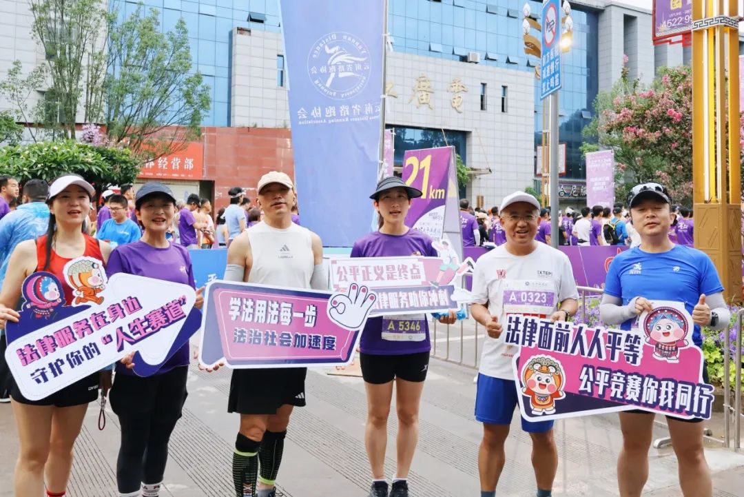 比赛期间,来自基层司法所和法律服务所的工作人员带着普法宣传标语参加健康跑,让法律知识伴随跑步传递,实现运动与普法的“双向奔赴”。