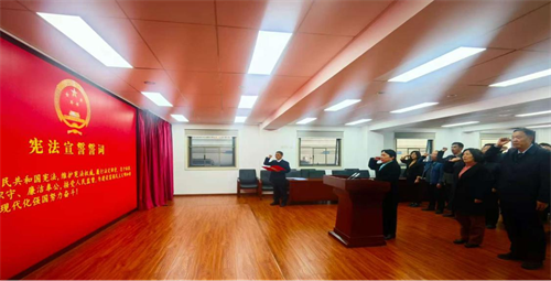 仪式现场国徽高悬,《中华人民共和国宪法》整齐摆放于宣誓台,气氛庄重而神圣。随着主持人宣布仪式开始,全体人员肃立,高唱中华人民共和国国歌。领誓席上,领誓人左手抚按宪法文本,目光坚定注视国徽进行领誓,全体宣誓人同步跟誓。铿锵有力的誓词回荡在会场,既是对宪法的郑重承诺,也是对初心使命的庄严宣告,彰显了全体干部尊法学法守法用法的坚定决心。