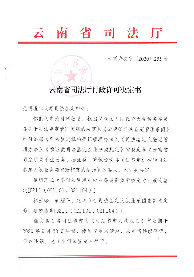 云南省司法厅行政许可决定书云司许决字〔2020〕255号