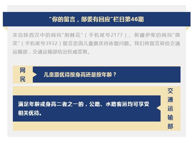 交通运输部一直高度重视儿童权益保障工作,在公路、水路客运领域已经建立了兼顾年龄和身高标准的票价优待机制,先后印发《交通运输部 国家发展改革委关于深化道路运输价格改革的意见》(交运规〔2019〕17号)、《交通运输部关于做好实施有关工作的通知》(交水规〔2020〕6号),明确对符合条件的儿童提供免费乘坐客运班车(国内水路客运船舶)或者客票半价优待(9座及以下客车除外)。其中,免票儿童的范围为6周岁(含)以下或者身高1.2米(含)以下;客票半价优待儿童的范围为6—14周岁或者身高1.2—1.5米。满足年龄或身高二者之一的,均可享受相关优待。下一步,我部将继续指导各地交通运输部门督促指导道路水路客运经营者认真落实儿童出行优待政策,切实保护儿童出行优待权益。