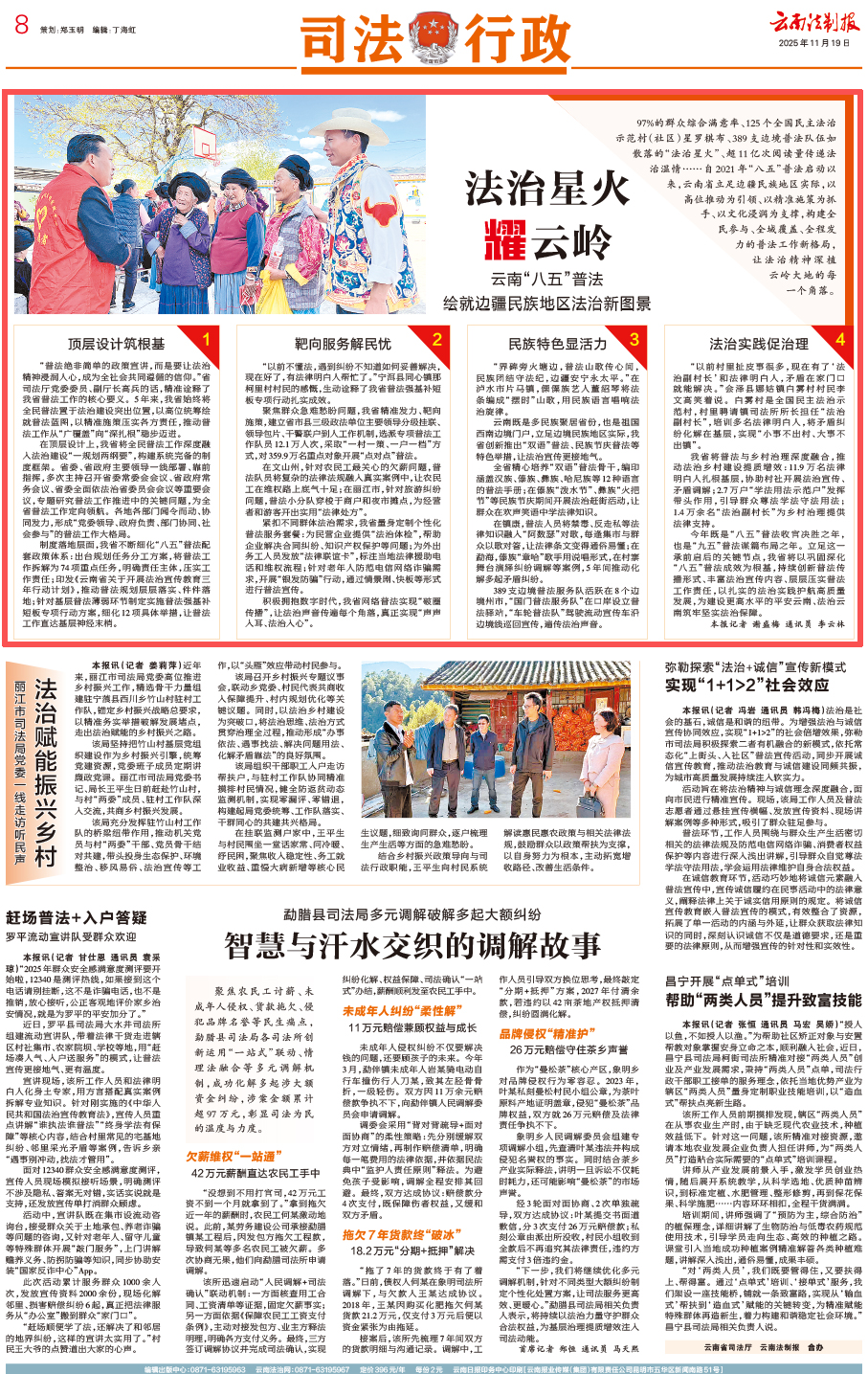 97%的群众综合满意率、125个全国民主法治示范村(社区)星罗棋布、389支边境普法队伍如散落的“法治星火”、超11亿次阅读量传递法治温情……自2021年“八五”普法启动以来,云南省立足边疆民族地区实际,以高位推动为引领、以精准施策为抓手、以文化浸润为支撑,构建全民参与、全域覆盖、全程发力的普法工作新格局,让法治精神深植云岭大地的每一个角落。