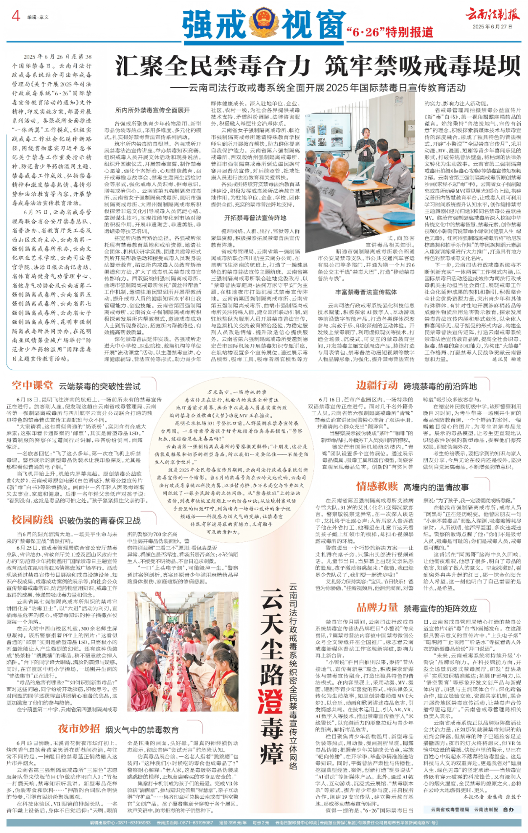 这是2025年全民禁毒宣传月期间,云南司法行政戒毒系统创新禁毒宣传的一个缩影。当6月的禁毒号角在云岭大地吹响,云南司法行政戒毒系统以科技为翼、以温情为桥,在市井烟火与万米高空间织就了一张全民防毒的立体网络。从“禁毒航班”上的法治宣传,到夜市快板里朗朗上口的防毒口诀;从边境村寨双语手册里的细致叮咛,到高墙内一场精心设计的亲子视频通话——科技感与烟火气的交融,让禁毒宣传既有穿透屏幕的震撼力,又有触手可及的亲和力。