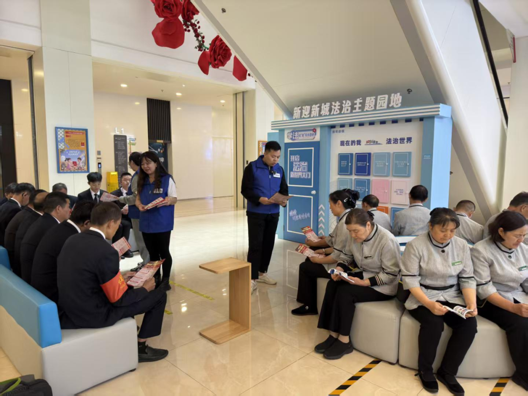 新迎新城购物中心作为辐射文艺路社区及周边多个小区的核心商业体,日均人流量超1万人次,且聚集了大量亲子家庭、上班族和商户,是开展普惠性法治宣传教育的理想场景。将法治主题园地嵌入商圈,能让居民在购物、亲子互动之余,轻松接触法律知识,感受“逛街即学法”的便捷体验。