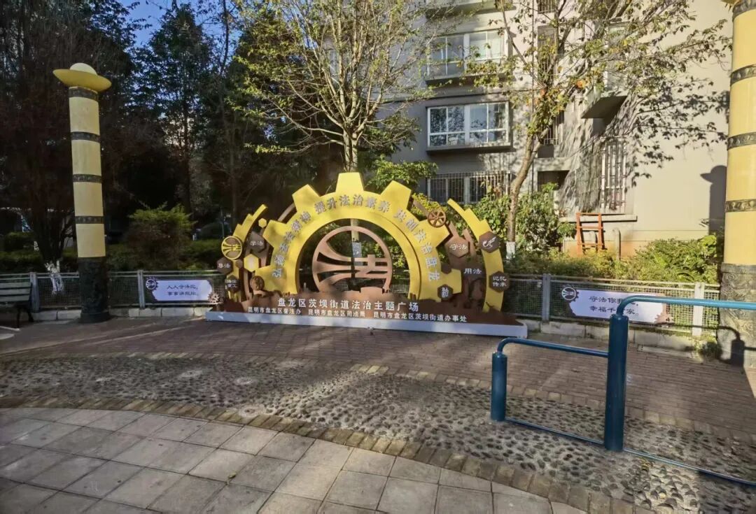 在昆明市盘龙区茨坝街道重工社区的昆重小区,由盘龙区司法局、区普法办、茨坝街道办事处联合重工社区打造了一处融合重工记忆与法治精神的法治文化阵地——茨坝街道法治主题广场。该广场以法治、文化、治理三维融合为设计理念,将法治宣传教育、重工文化传承、社区共治共享功能有机统一,打造出具有地域特色、功能复合的基层治理新空间。