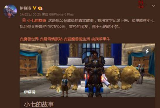 近日,微博上一篇名为“小七的故事”的文章引起魔兽世界玩家的关注,文中主角小七是一名16岁的魔兽玩家,在他父亲去世后,他开始玩《魔兽世界》,而他的愿望是希望能够找到父亲曾经待过的公会,“走一走爸爸曾经走过的路,看一看爸爸曾经见过的风景”。