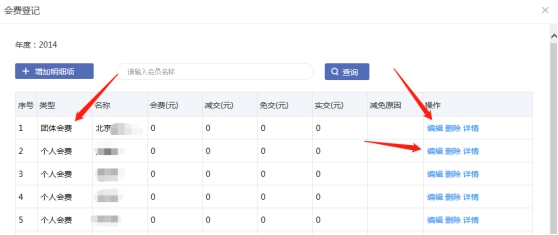 5、依次将团体会费及个人会费填写完毕后,关闭弹框,返回列表,点击右侧“收入登记”按钮,进行收入登记。