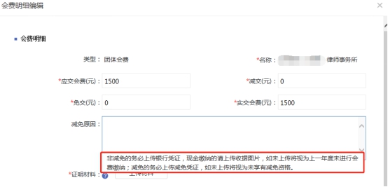 1、在我省国家扶贫开发工作重点县设立的律师事务所,在团体会费上传相关证明材料里上传证照扫描件(要可以看到注册地址),个人会费登记中不必再上传;凡在我省国家扶贫开发工作重点县和边境县新设立的律师事务所,自准予设立之日起免交三个执业年度的团体会费的,在团体会费上传相关证明材料里上传证照扫描件(要可以看到注册地址和注册时间),证照无法证明注册地址和注册时间的,可上传其它证明资料,例如已审批过的注册申请表等。