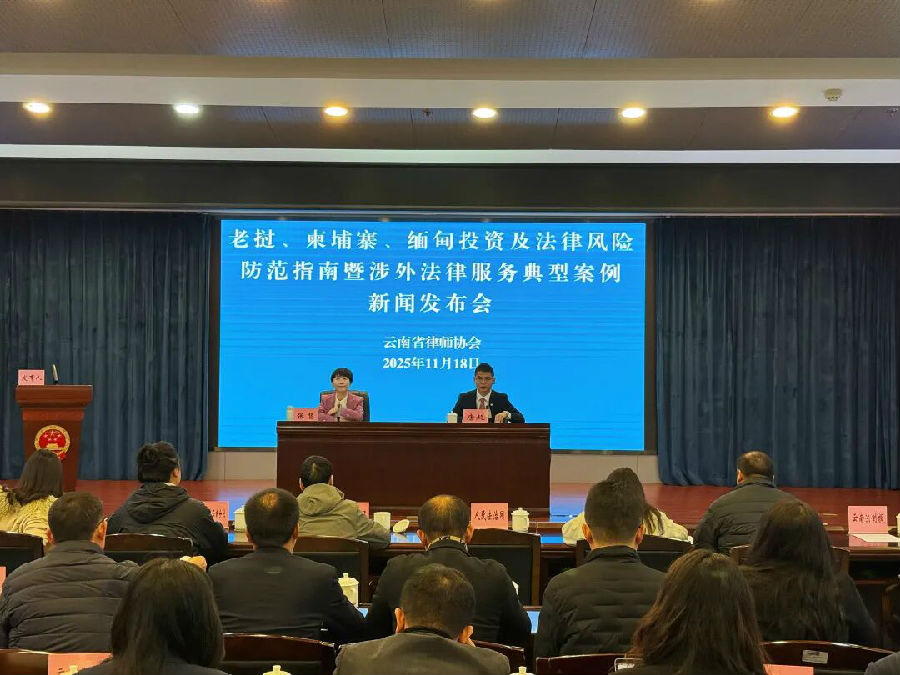 2025年11月18日,云南省律师协会召开老挝、柬埔寨、缅甸投资及法律风险防范指南暨涉外法律服务典型案例新闻发布会。十四届全国人大代表、云南省律师行业党委副书记、省律师协会副会长、女律师分会会长、省律师行业妇联主席张慧介绍云南省涉外法律服务工作基本情况,云南省相关涉外律师发布老挝、柬埔寨、缅甸投资及法律风险防范指南和涉外法律服务典型案例并回答记者提问,省律师协会南亚东南亚涉外法律服务业务研究委员会主任唐超主持发布会。