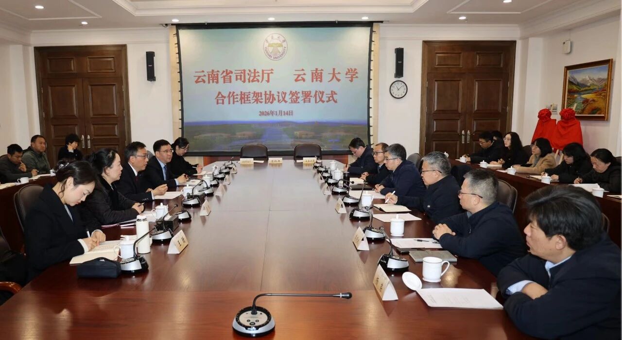 2026年1月14日,云南省司法厅与云南大学合作框架协议签约仪式暨行政复议理论研究中心、法学教学实践基地揭牌仪式在云南大学隆重举行。云南省司法厅党委书记、厅长刘宗根,云南大学党委副书记、校长马文会出席仪式并致辞。